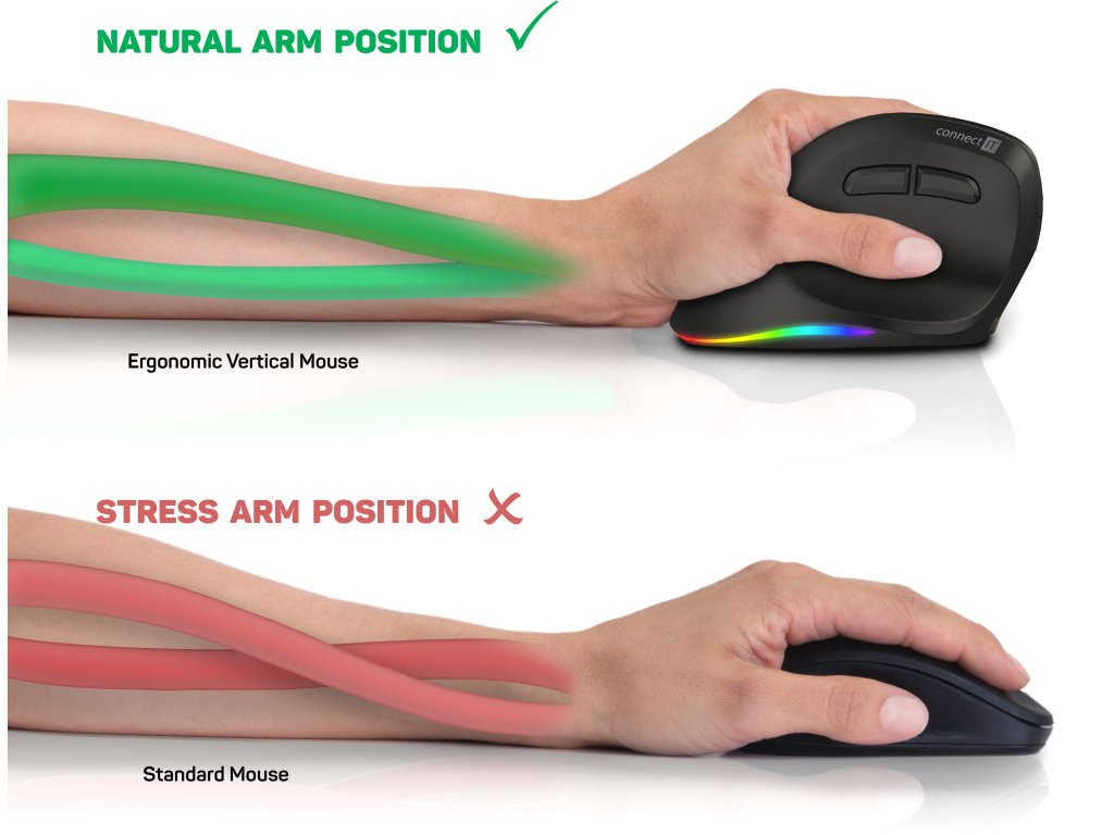 Při práci s běžnou počítačovou myší jsou kosti předloktí v nepřirozeně zkřížené poloze a již po krátké době dochází k bolestem a únavě celého předloktí. Při dlouhodobém používání takové myši může dojít k chornickým problémům s nutností vyhledat lékařskou pomoc.