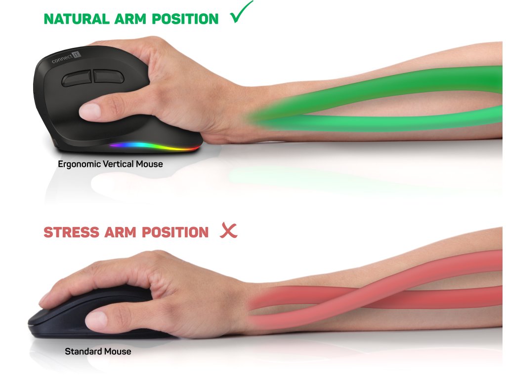 Při práci s běžnou počítačovou myší jsou kosti předloktí v nepřirozeně zkřížené poloze a již po krátké době dochází k bolestem a únavě celého předloktí. Při dlouhodobém používání takové myši může dojít k chornickým problémům s nutností vyhledat lékařskou pomoc.