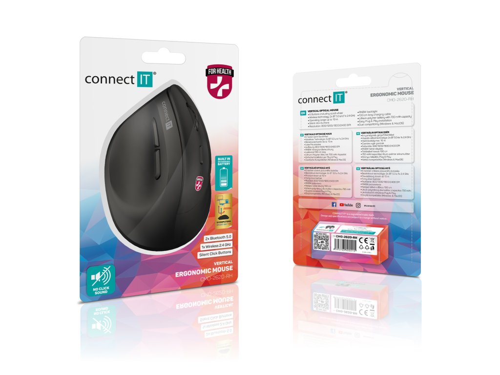 Vertikální ergonomická optická bezdrátová myš FOR HEALTH Cloudy BLACK určená speciálně jako prevence proti syndromu karpálního tunelu. Nabízí možnost připojení až na tři zařízení díky technologii TriMode (2x BT 5.0 + 2.4 GHz wireless). Disponuje RGB podsvícením, 6 tlačítky včetně precizního rolovacího kolečka a rozlišením až 2400 DPI.