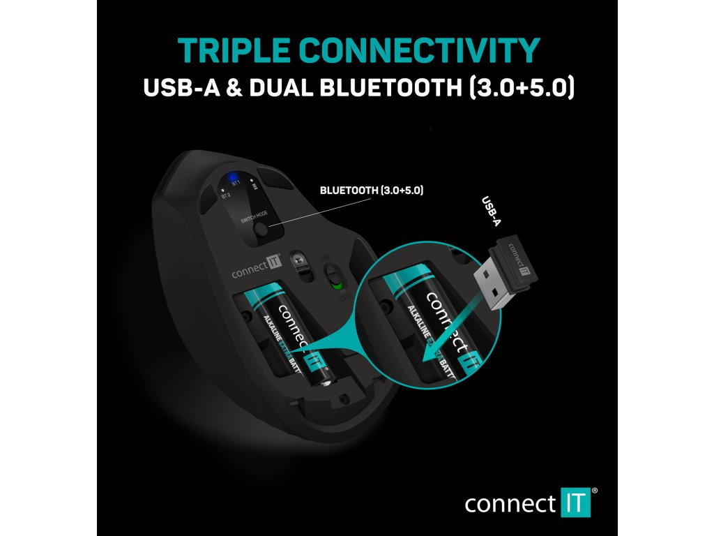 Unikátní technologie Triple SmartSwitch umožňuje používat myš až na třech zařízeních, které podporují BT 5.0, 3.0 nebo disponují USB-A vstupem. Tato funkce je ideální pro profesionální i domácí použití všude tam, kde je potřeba pracovat s jednou myší střídavě na více počítačích nebo noteboocích. Levé a pravé tlačítko myši vybavené technologií SilentClick s tichým chodem, který při klikání nevydává žádný zvuk. Samozřejmostí je integrovaný úložný prostor pro USB Nano přijímač pod krytkou bateriového prostoru. Součástí balení je originální alkalická tužková baterie CONNECT IT.